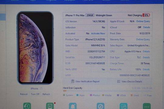 SOLD FOR PARTS ONLY: A pre-owned Apple iPhone 11 Pro Max (Global/A2218) 256GB in Midnight Green (iCloud activation locked. Some scratches to screen glass) (Checkmend report ID: CM16716125-E08A1).