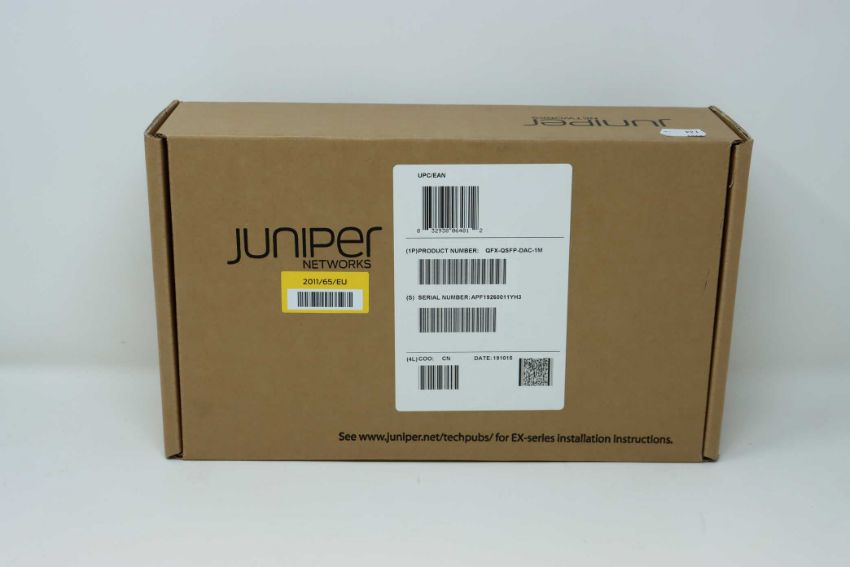 A boxed as new Juniper QFX-QSFP-DAC-1M QSFP+ to QSFP+ Ethernet Direct Attach Cable (Box sealed).