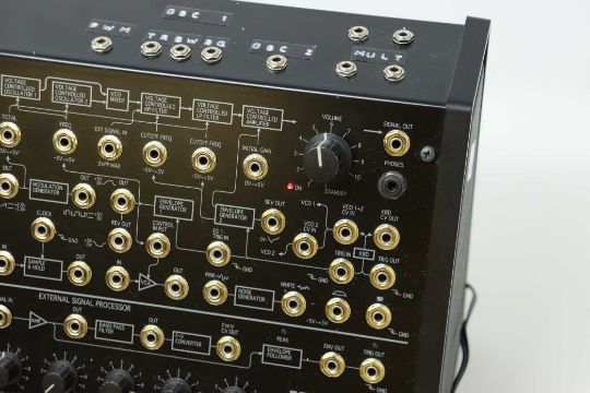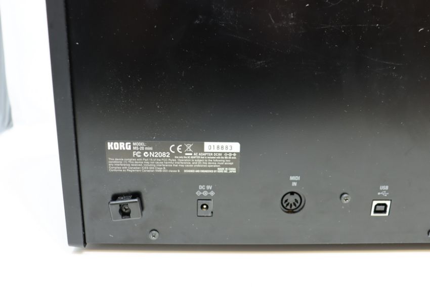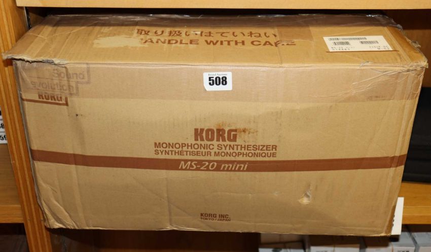 A pre-owned Korg MS-20 Mini Synthesizer with power supply and box.