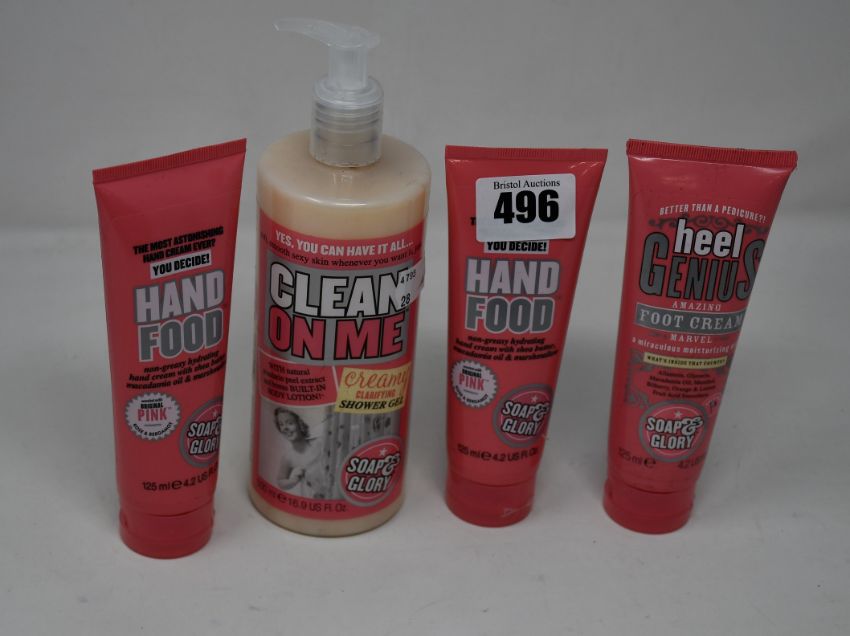 A quantity of boxed as new Soap & Glory beauty products to include hand food hand cream (125ml) and creamy clarifying shower gel (500ml) (Approximately 24 items).