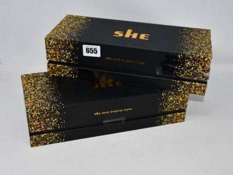 Two boxed as new She Gold Original Hair Styling Irons (IP40M, box slightly damaged).