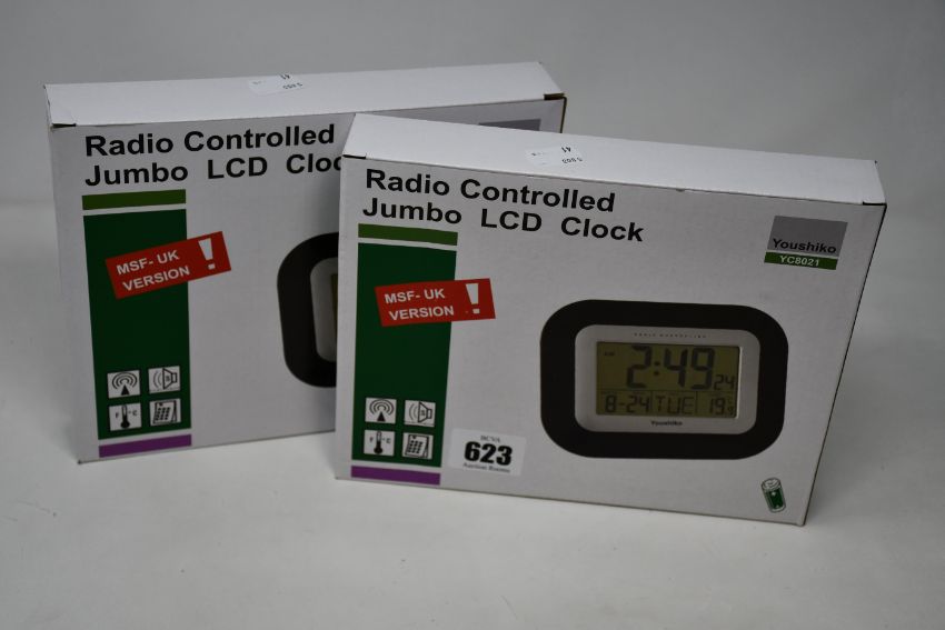 Seven boxed as new Youshiko Radio Controlled Jumbo LCD Clock (YC8021).