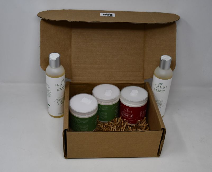 Two Inahsi soothing mint moisturizing conditioner (226g), two Inahsi soothing mint sulfate free clarifying shampoo (226g) and one Inahsi aloe hibiscus leave-in conditioner and detangler (226g), all as new.