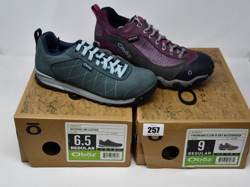 A pair of ladies Oboz Firebrand II Low B-Dry waterproof walking shoes in lilac (UK 6.5) and a pair of ladies Oboz Bozeman Low Leather walking shoes in slate (UK 4), both boxed as new.