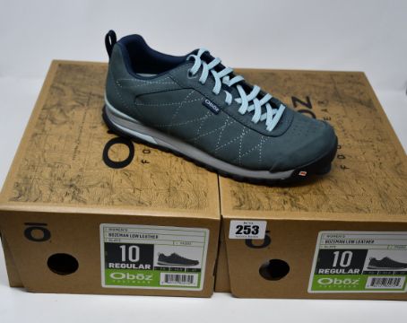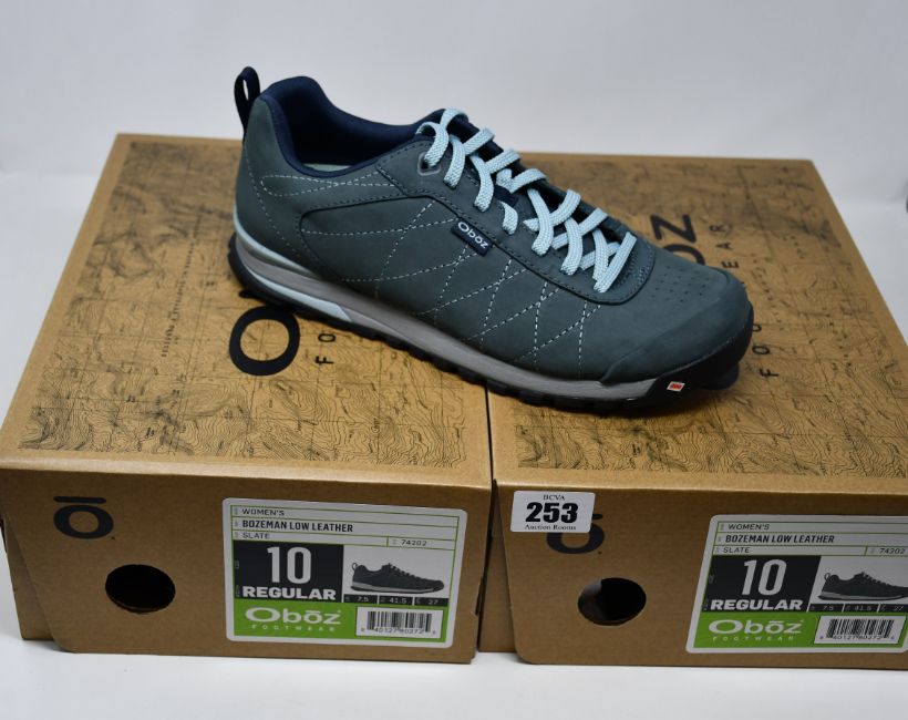 Two pairs of ladies' boxed as new Oboz Bozeman Low Leather walking shoes in slate (UK 7.5).