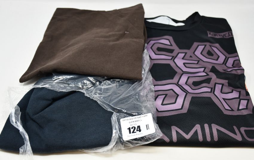 An as new Cactus Jack Gaming long sleeve jersey (L), Cactus Jack For Tenet T-shirt (L) and one other Cactus Jack T-shirt (M).