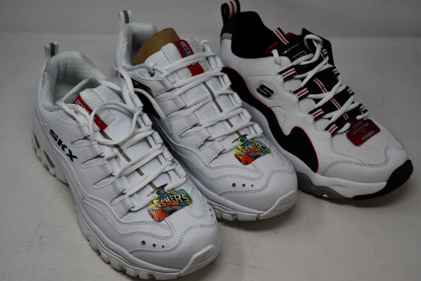 Two pairs of as new Skechers SKX trainers (UK 11, 12) and a pair of Skechers D'Lites 3.0 (UK 10) (No boxes).