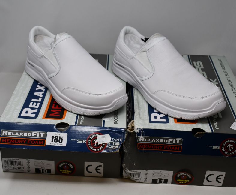 Two pairs of as new Skechers Work relaxed fit memory foam Flex Advantage shoes in white (UK 9,10 - Damage to one of the boxes but shoes undamaged).