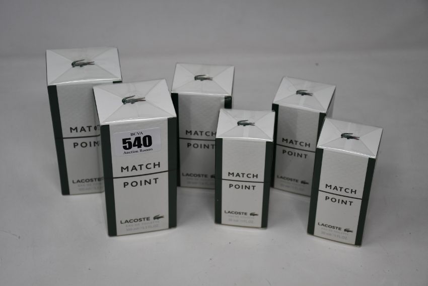 Six boxed as new Lacoste Match Point eau de toilette (2 x 100ml, 1 x 50ml and 3 x 30ml).