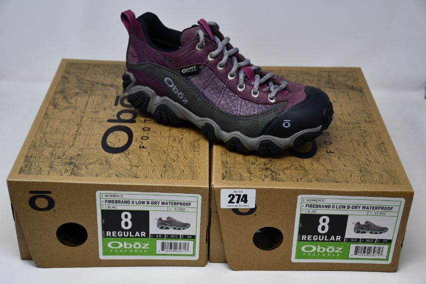 Two pairs of ladies boxed as new Oboz Firebrand II Low B-Dry waterproof walking shoes in lilac (UK 5.5).