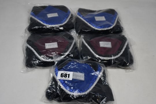 Three boxed as new Equino horse ear bonnet in black with blue full and two boxed as new Equino horse ear bonnet in black dark red full.