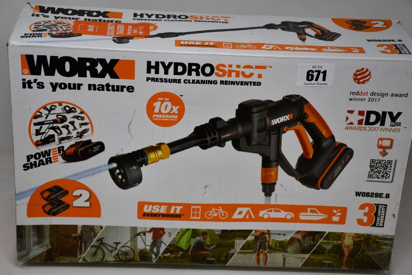A boxed as new Worx Hydroshot pressure cleaning gun (WG629E.6).