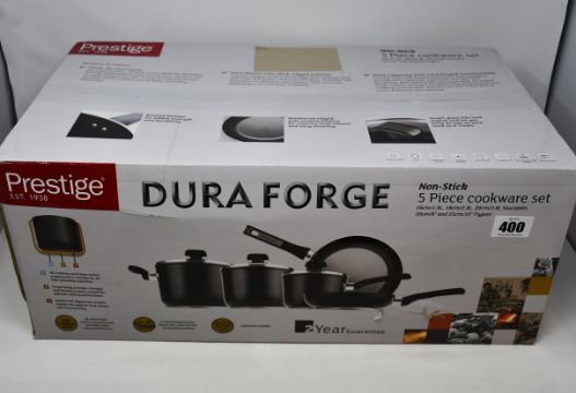 Two boxed as new Prestige Dura Forge non-stick five piece cookware sets.