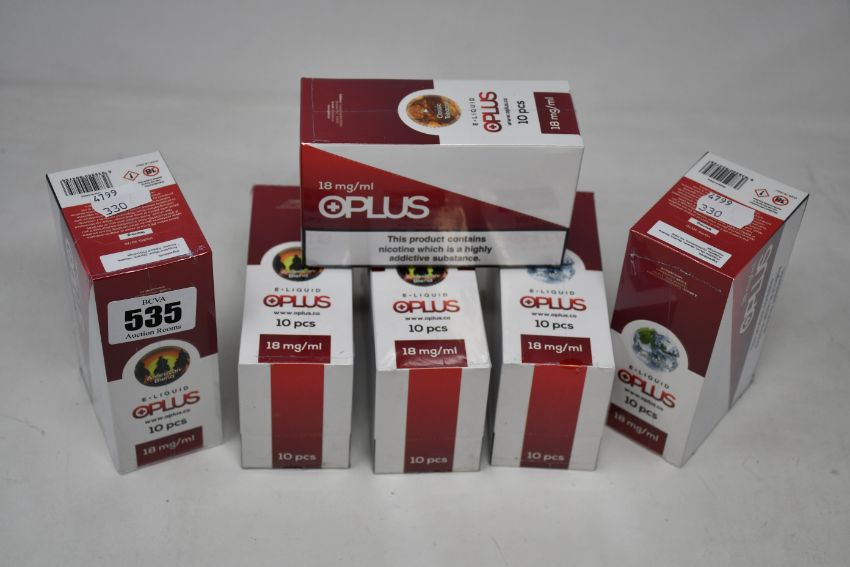 Six boxes of ten (10ml) OPLus E-Liquid in American Blend, Classic Tobacco and Ice Mint 18mg/ml (Over 18s only).