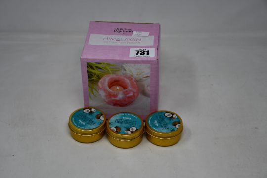 A quantity of boxed as new Spirit of Equinox tea light candles and related items to include Spirit of Equinox Himalayan salt tea light holders, Coconut Beach eco soy wax melts and one Spirit of Equinox Himalayan 1.5-2kg salt lamp (Approximately: 30 items).
