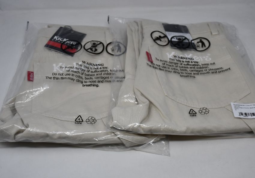 Two pairs of men's as new Kickers utility trousers in sand (Both 30 - RRP £60 each).