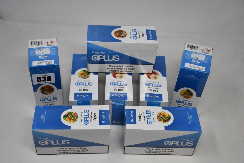 Eight boxes of ten (10ml) OPLus E-Liquid in Classic Tobacco, Apple and Fruit Mix 6mg/ml (Over 18s only).