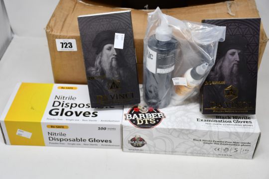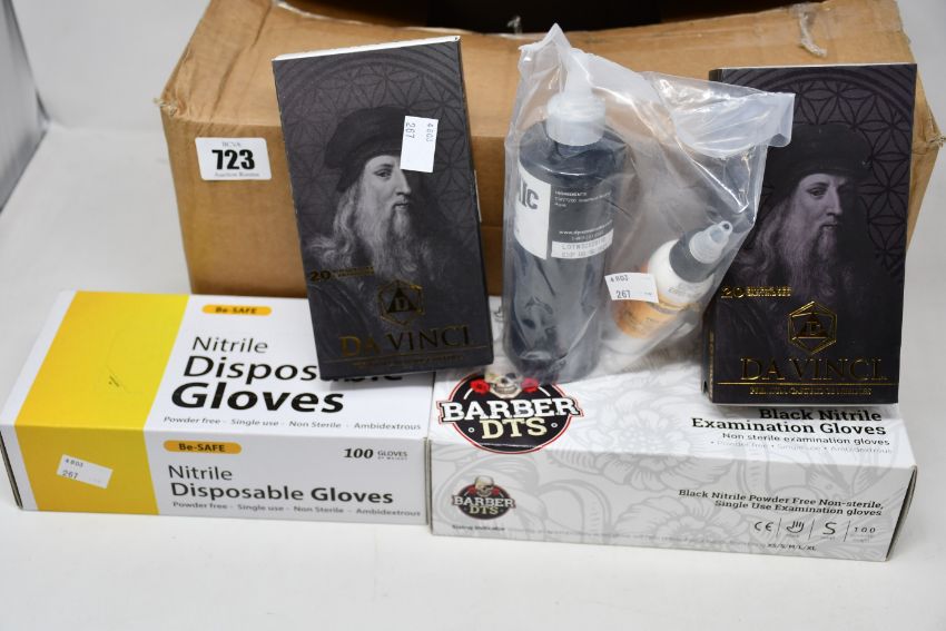 One boxed as new Bishop Da Vinci Premium Tattoo Cartridge Needles (C1003RL. Box of 20). One boxed as new Bishop Da Vinci Premium Tattoo Cartridge Needles (C1021M1C-1. Box of 20). One boxed as new Bishop Da Vinci Premium Tattoo Cartridge Needles (C1011M1C-1. Box of 20). One boxed as new Barber DTS Black Nitrile Examination Gloves (Size S. Ambidextrous). One boxed as new Be-SAFE Nitrile Disposable Gloves (Size M. Ambidextrous). One boxed as new Dynamic Black tattoo ink. One boxed as new Spirit Classic Thermal tattoo stencil paper.