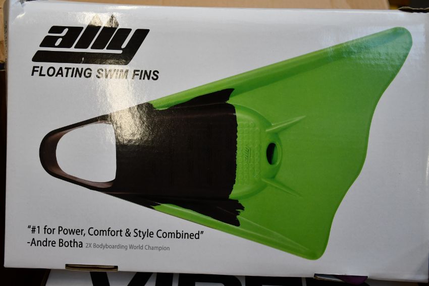 A pair of Ally Floating Swim Fins in black and purple (XL), a pair of MS Viper Swim Fins in grey and green (XXL) and a pair of Viper V5 Yellow Dot Surfing Fins (XL), all as new.