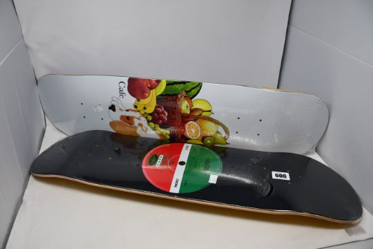 Five as new skateboard decks to include one Skateboard Café 8.25 vinyl skateboard deck in red and black, one Skateboard café 8.125 healthy skateboard deck in navy blue and light blue, one Skateboard café 8.125 skateboard deck in orange and light blue, one Skateboard café 8.0 vinyl skateboard deck in black and one Skateboard Café 8.0 vinyl in yellow and black.