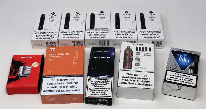 A quantity of assorted boxed as new vaping items to include: 1 x VooPoo Drag X Kit, 1 x Proto 650 Kit, 1 x My Blu Intense Starter Kit, 1 x ThorVap Smart Mini Kit, 1 x Smok V12 Mesh (3 pack) and 5 x Vype ePod Kits.