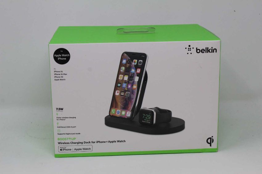 A boxed as new Belkin Boost Up Wireless Charging Dock for iPhone and Apple Watch (M/N: F8J235MYBLK) (Box sealed).