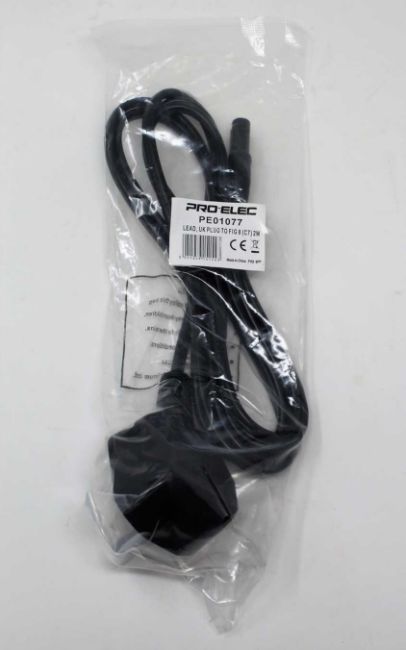 A box of one hundred as new Pro-Elec PE01077 UK Plug to 'Figure-8' (C7) Type Mains Lead, Black, 2m (Individual packaging sealed).
