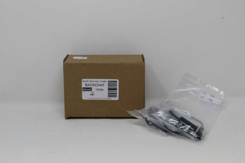 A boxed as new Brigade 1334A Backchat Speaking Alarm with Left Turn Warning Alert (SS-BC-08/12-24v L/Turn) (Box opened) and three as new Brigade UDS-000HSS 3718 Side Scan Sensors (packaging sealed).