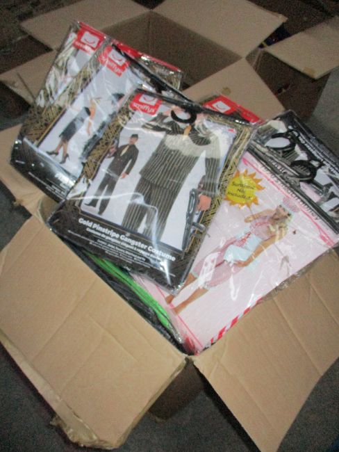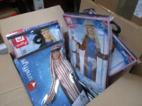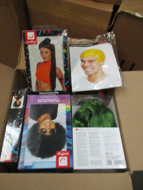 Assorted stock from a fancy dress and party store; Costumes and accessories by Smiffys, Fever and Wicked etc. Costumes to include adult 1920's, children's nativity, assorted children's/infant costumes. Accessories to include Halloween masks, badges, banners, party accessories, Christmas hats, liquid latex, wigs and clown accessories.
