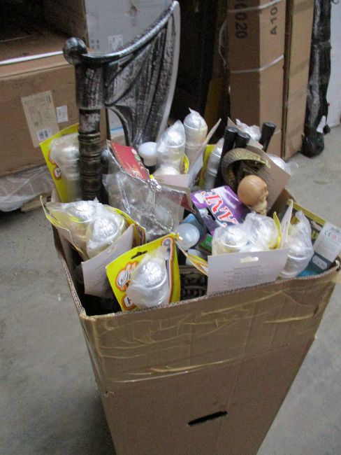 Assorted stock from a fancy dress and party store; Costumes and accessories by Smiffys, Fever and Wicked etc. Costumes to include adult fairytale. Accessories to include weapons, canes, staffs, birthday candles, Halloween decorations, clapperboards, tights, LED lights, spud guns, wig heads and practical jokes.