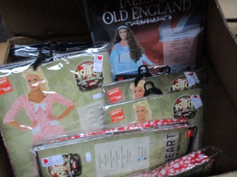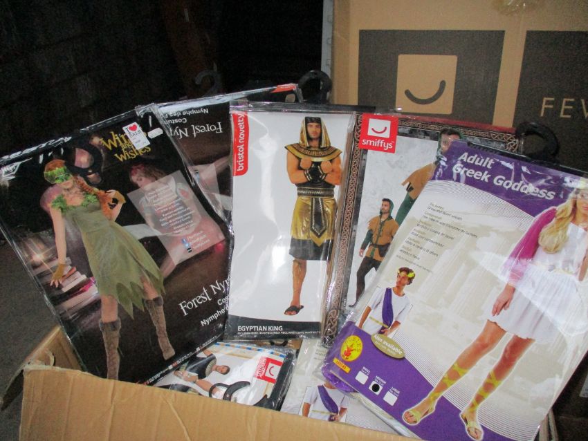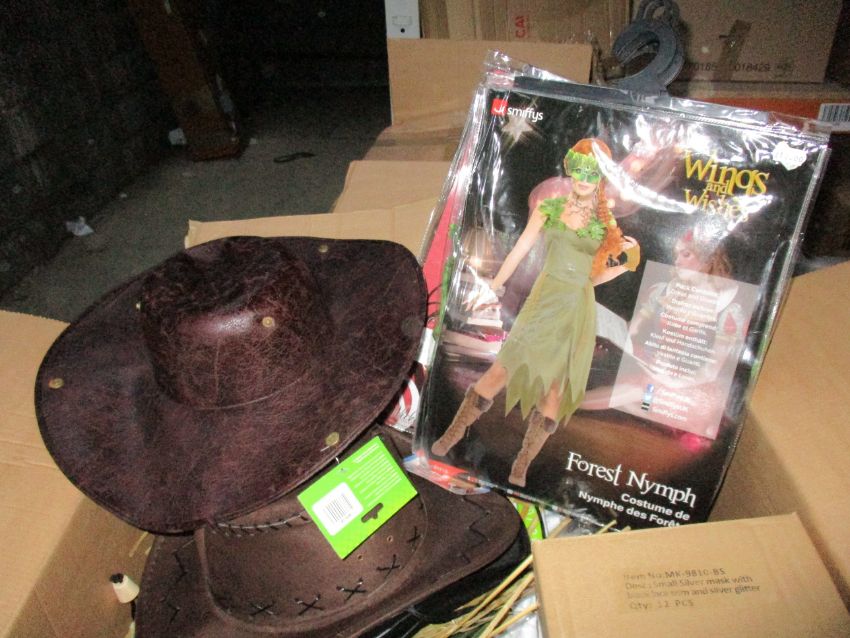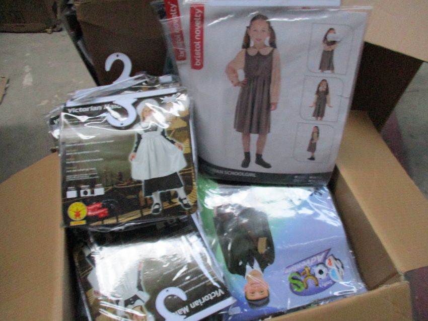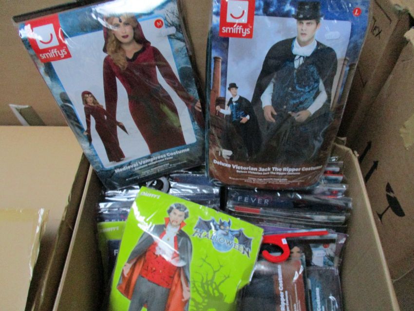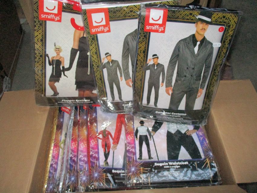 Assorted stock from a fancy dress and party store; Costumes and accessories by Smiffys, Fever and Wicked etc. Costumes to include children's and adult's pirates, adult historical, military, adult Halloween, children's Victorian and women's 40's/50's. Accessories to include wigs, LED lights, hats, and novelties.