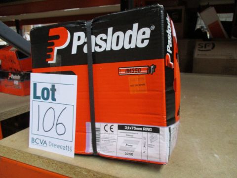 Four Paslode 141227 3.1 x 75mm Round Ring Shank Nails x 2200 with 2 Fuel Cells (Some cosmetic damage to boxes).