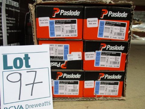Six boxes of Paslode 921588 1.6 x 32mm F16 Straight Brads x 2000 with 2 Fuel Cells.