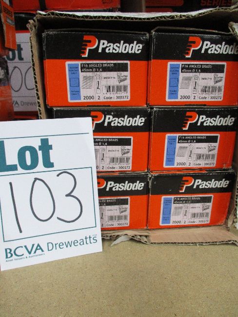 Six boxes of Paslode 300272 1.6 x 45mm F16 Angled Brads x 2000 with 2 Fuel Cells.