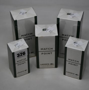 Three Lacoste Match Point eau de toilette (30, 50 and 100ml) and two Lacoste Match Point shower gel (150ml), all boxed as new.