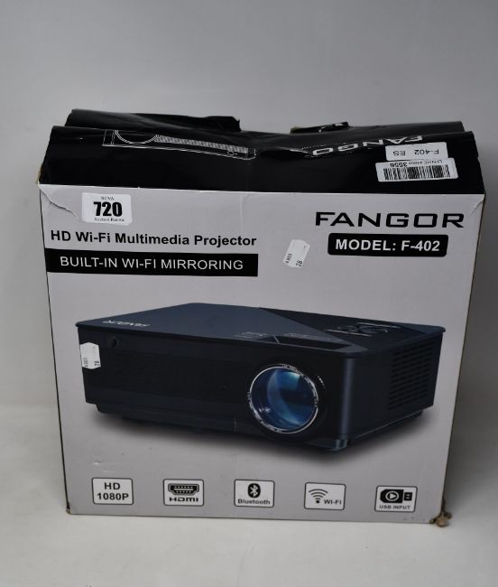 A boxed Fangor F-402 HD Wi-Fi Multimedia projector (Box damaged).