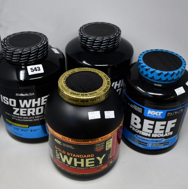 Two BioTech USA ISO Whey Zero protein isolate drink powders (2270g) inlemon cheesecake and strawberry flavour, one Optimum Nutrition Gold Standard 100% Whey (2280g) and one NXT Nutrition Beef protein isolate in blue raspberry flavour (1800g).