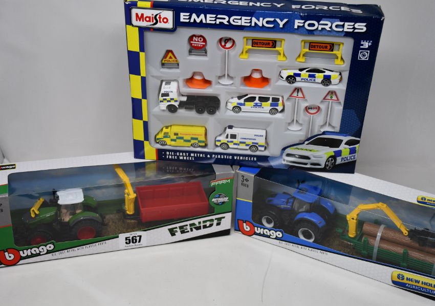 A quantity of boxed as new Maisto and Burago model vehicles to include four Special Edition 1:24 bugatti Divos, three Lamborghini Huracan Performante, 24 Fresh Metal Burnin' Key Cars and Fendt and New Holland Agriculture tractors (20 items plus 24 key cars).