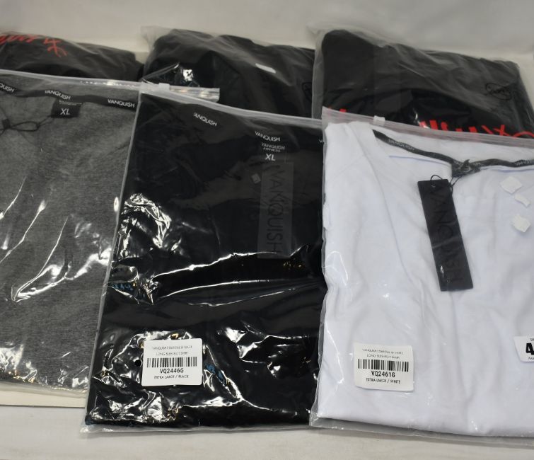 Two men's Vanquish Triumph Pullover hoodies in black and blackout (XXL), three Vanquish long sleeve T-shirts in black, white and grey (XL) and one Vanquish sweatpants in black (XL), all as new.