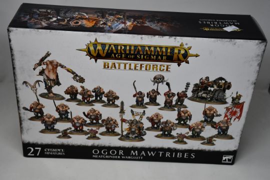 A boxed as new Warhammer Battleforce Ogor Mawtribes Meatgrinder Warglutt (27 Citadel Miniatures).