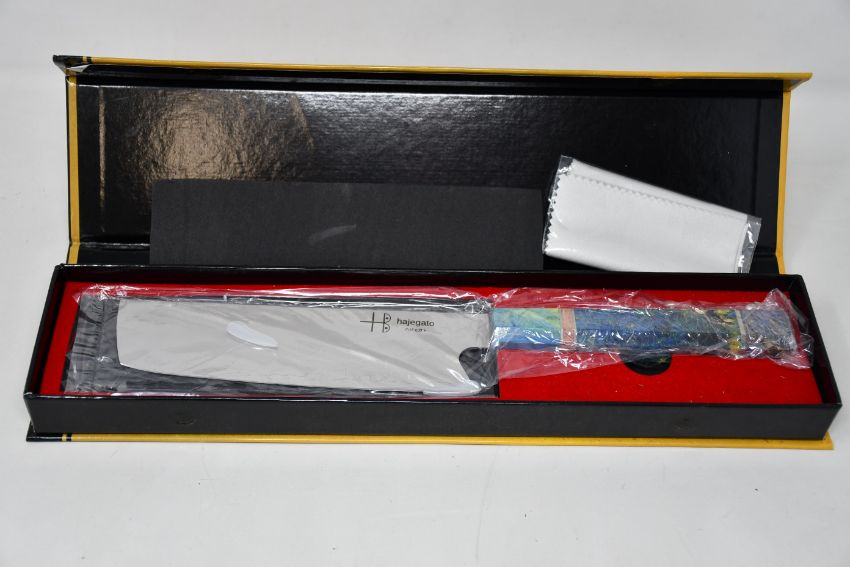 A boxed as new Hajegato Unique Collection 7" Damascus Nakiri Chef's Knife (Over 18s only).