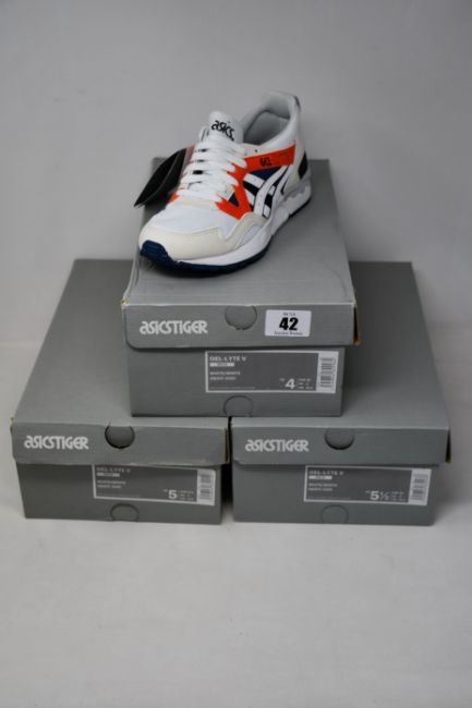 Three pairs of as new Asics Tiger Gel-Lyte V trainers (UK 3, 4, 4.5).