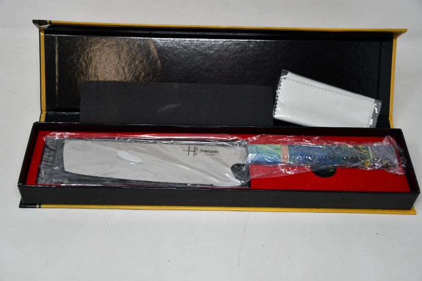 A boxed as new Hajegato Unique Collection 7" Damascus Nakiri Chef's Knife (Over 18s only).