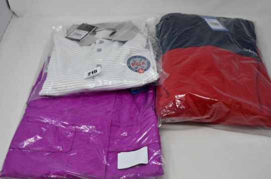 Five items of as new Adidas sportswear; women's Windbreaker in vivid pink (UK 14 - RRP £49), Originals Classics hooded sweatshirt in scarlet/collegiate navy (2XL - RRP £43), two Performance Stripe polo shirts (S, L - RRP £33 each) and Adidas by Pharrell Williams PW Basics crew (M - RRP £69).