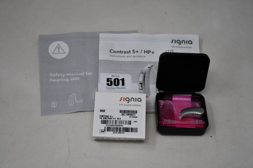 A boxed as new Signia Contrast S+ hearing aid in silver.