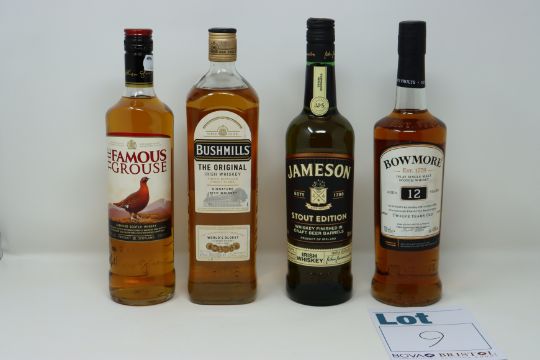 Five bottles of miscellaneous whiskeys to include The Famous Grouse, Bushmills The Original and Jamesons Stout Edition (Over 18s only).
