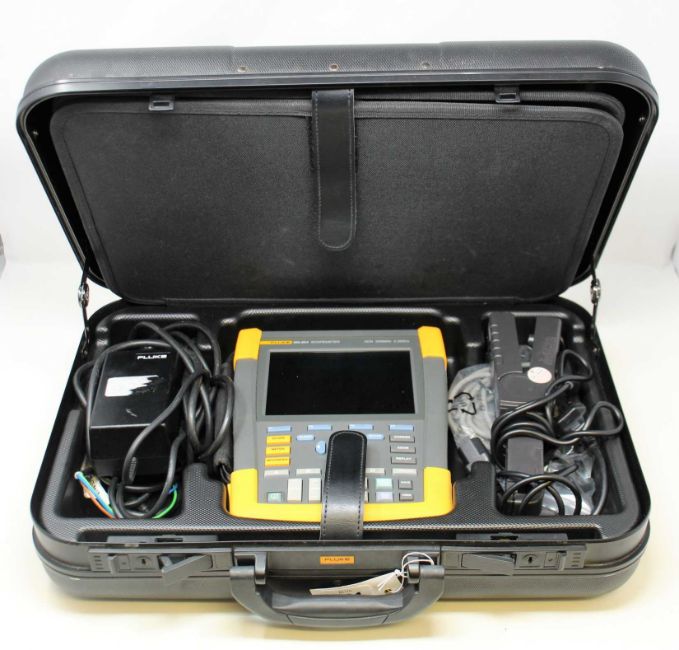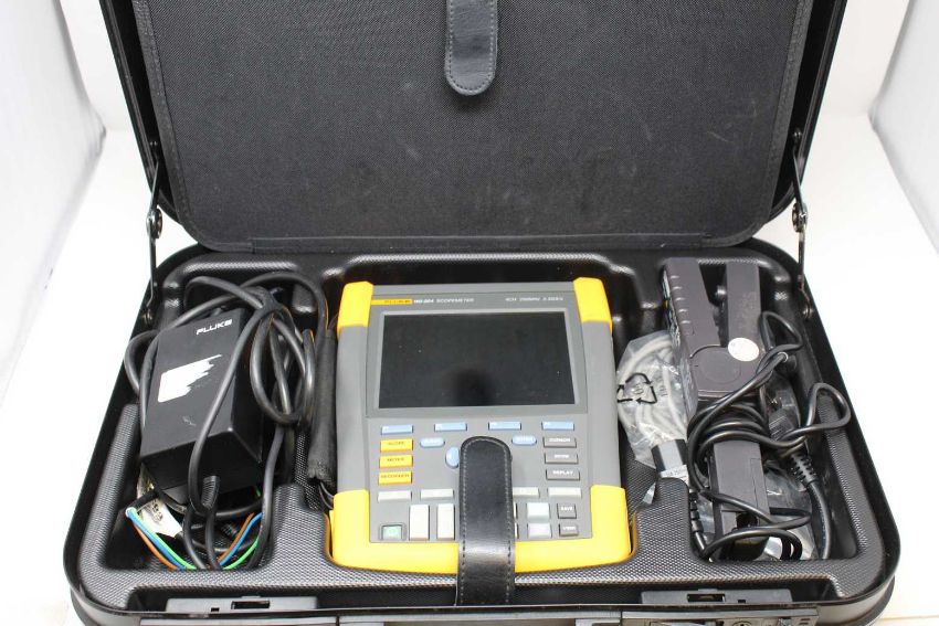 A pre-owned Fluke ScopeMeter 190-204 4 Channel 200MHz 2.5GS/s Portable Digital Color Oscilloscope with Fluke BC190/808 Battery Charger, four Fluke Probes (VPS410-V/G/R & B), a Chauvin Arnoux E3N AC/DC Current Clamp, various manuals and calibration certificates and software CD in a lockable carry case.