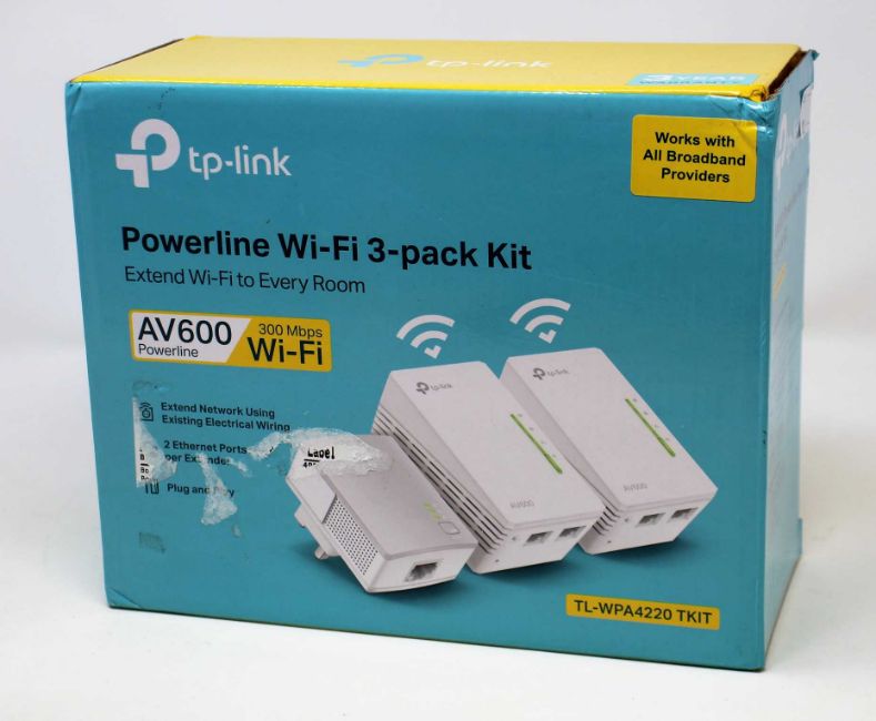A boxed as new TP Link Powerline 600 Wi-Fi 3-pack Kit (TL-WPA4220 TKIT) (Some cosmetic damage to box).
