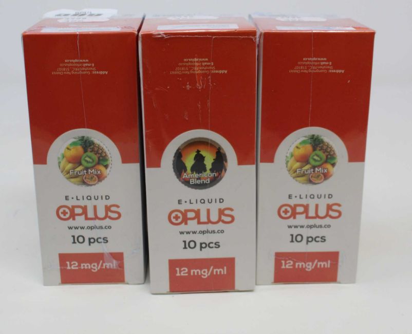 Six boxes of ten (10ml) OPLus E-Liquid in Fruit Mix and American Blend 12mg/ml (Over 18s only).