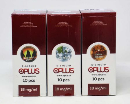 Six boxes of ten (10ml) OPLus E-Liquid in American Blend, Classic Tobacco and Ice Mint 18mg/ml (Over 18s only).